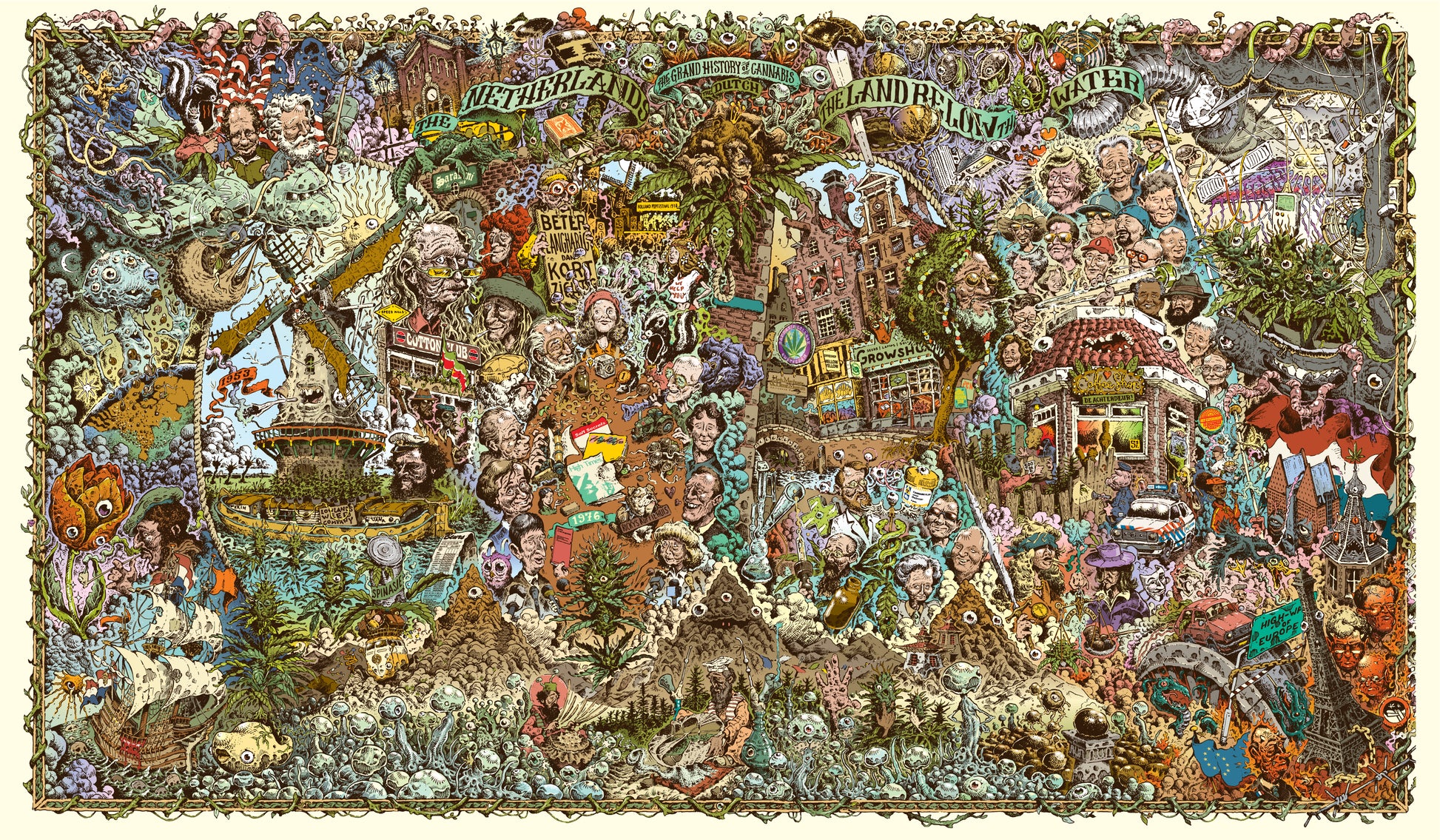 The artwork depicts a short but turbulent time in Netherlands - from about the 50s until the late 2000s the Netherlands were the epi-center of what was cannabis globally during that time. The laws that were created during the very liberal 70s opened the door for many cannabis refugees to come to Holland. Together with the adventurous native Dutch they teamed up to work on their craft and lay the foundation for what is cannabis as we know today. The golden era of Dutch cannabis!